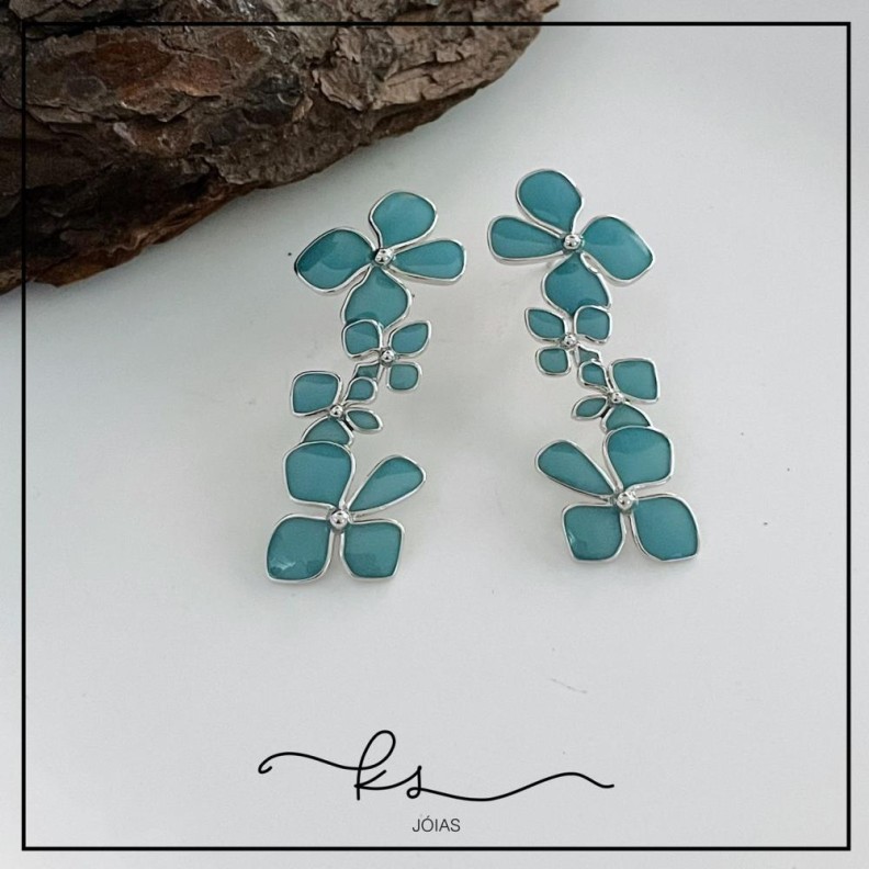brinco ródio longo flores esmaltado azulConfira opiniões e avaliações de clientes!