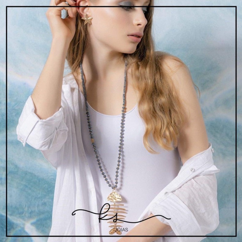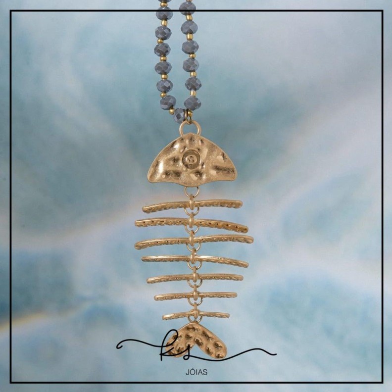 colar ouro longo cristais búlgaros azuis com peixe grande - 90cmConfira opiniões e avaliações de clientes!