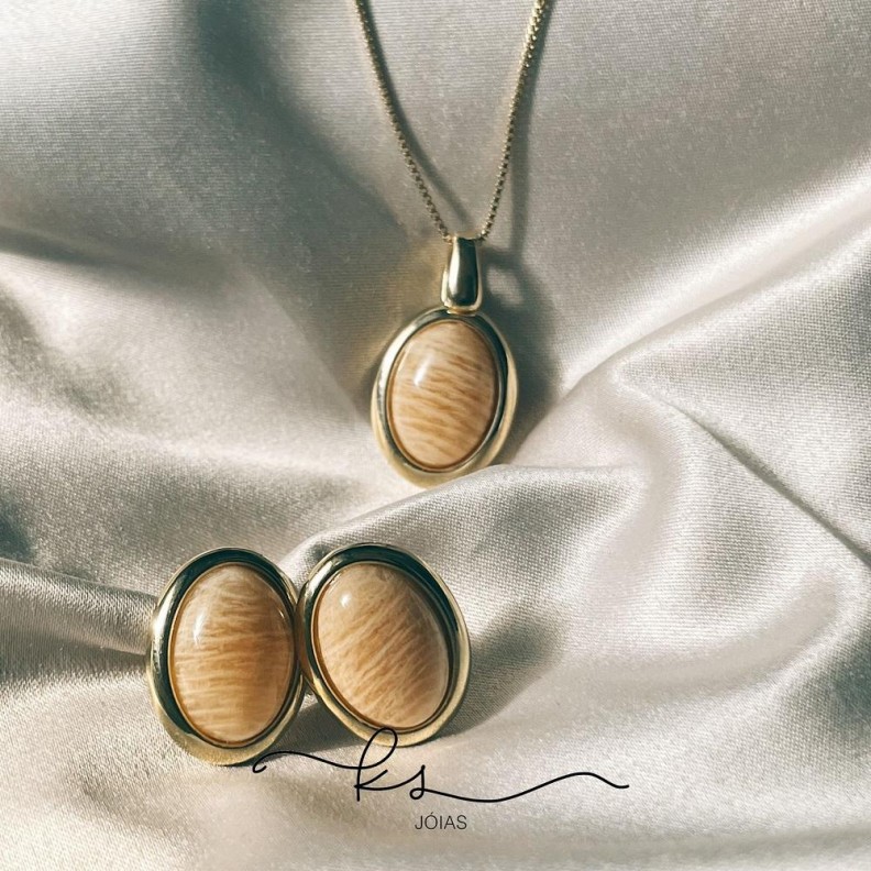 conjunto ouro pedras naturais amazonita bege ovalConfira opiniões e avaliações de clientes!
