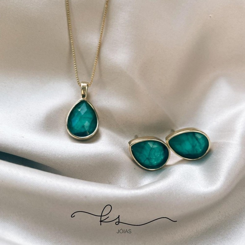 conjunto ouro pedras naturais esmeralda gotaConfira opiniões e avaliações de clientes!