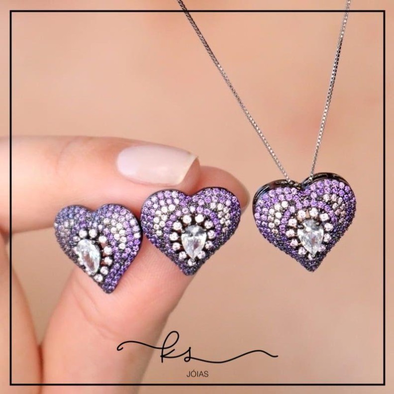 conjunto ródio negro com coração cravejado zircônias rosa e lilás com gota cristalConfira opiniões e avaliações de clientes!