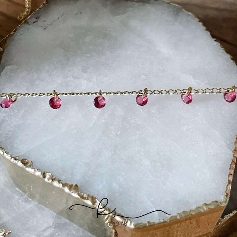 pulseira ouro com bolinhas cristais vermelhos penduradosConfira opiniões e avaliações de clientes!